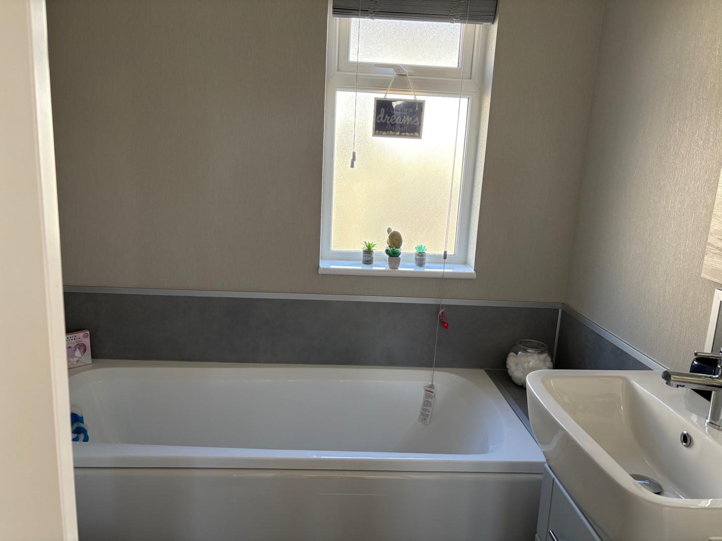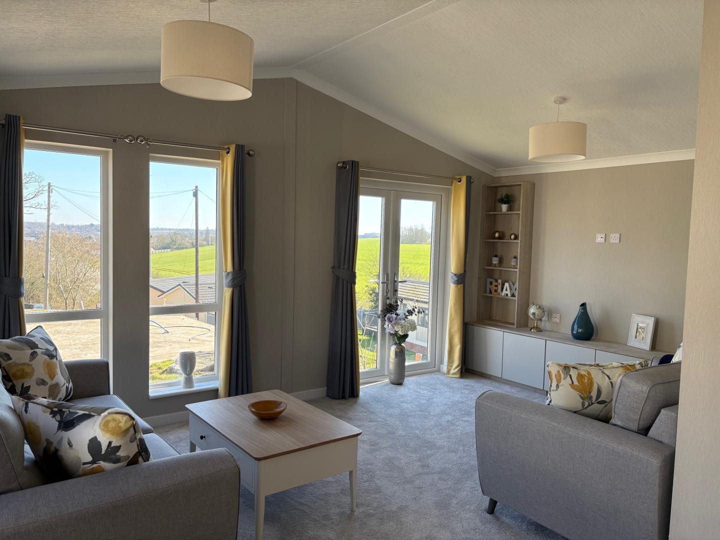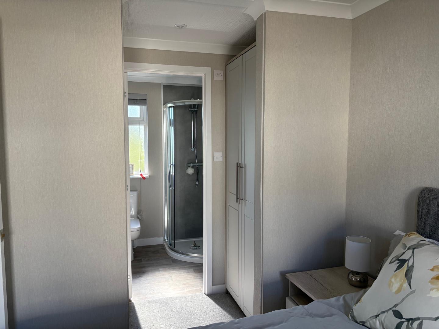 This 2 double bedroom park home offers plenty of living space for its money. The home is offered for sale fully furnished making your move much simpler. This simple yet stylish park home benefits from floor to ceiling windows in the lounge allowing plenty of natural light in, and French doors to the lounge area both of which offer views of the local countryside. The French doors also give the option for you to install your own decking which will allow you to enjoying the long summer days. You get a real feeling of openness with a large, semi-open plan living space where the lounge and dining area form an ‘L’ shape and the kitchen is open through to the dining area which is fully fitted with base and eye level units and integrated appliances. There is also an ensuite shower room to the master bedroom as well as a walk in dressing area. Both bedrooms are finished with fitted furniture. The main bathroom is partly tiled and finished with bath, WC and basin.