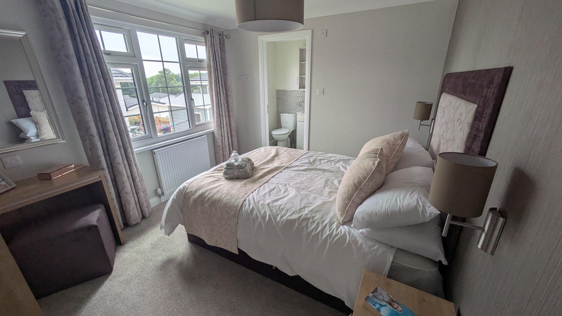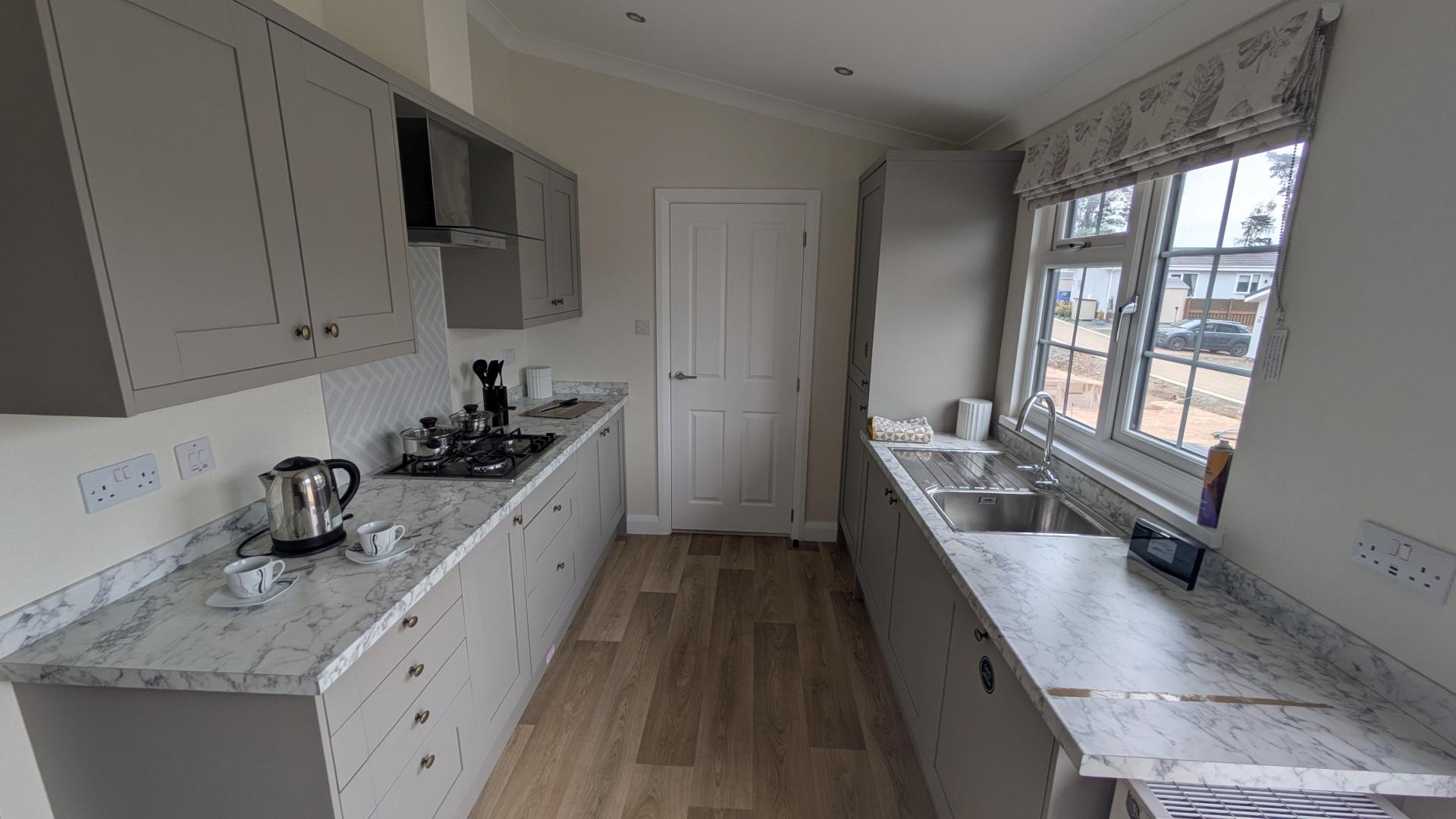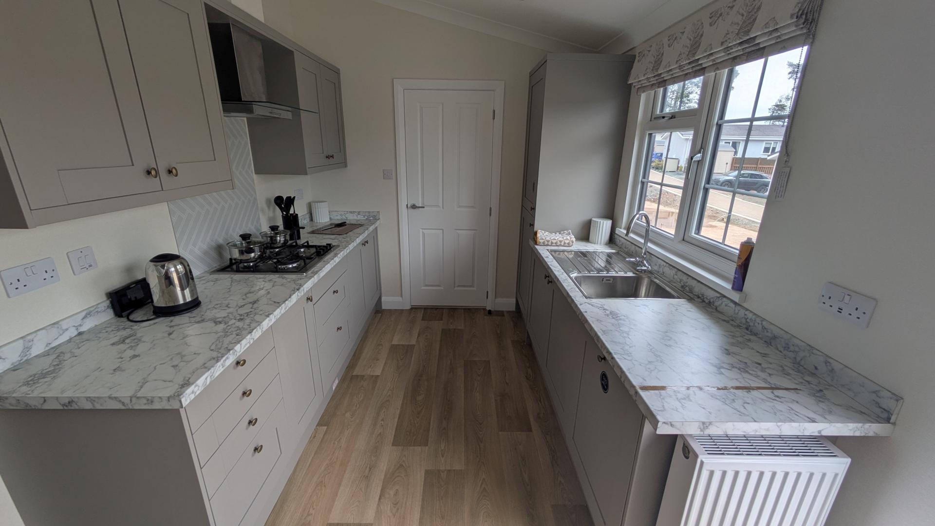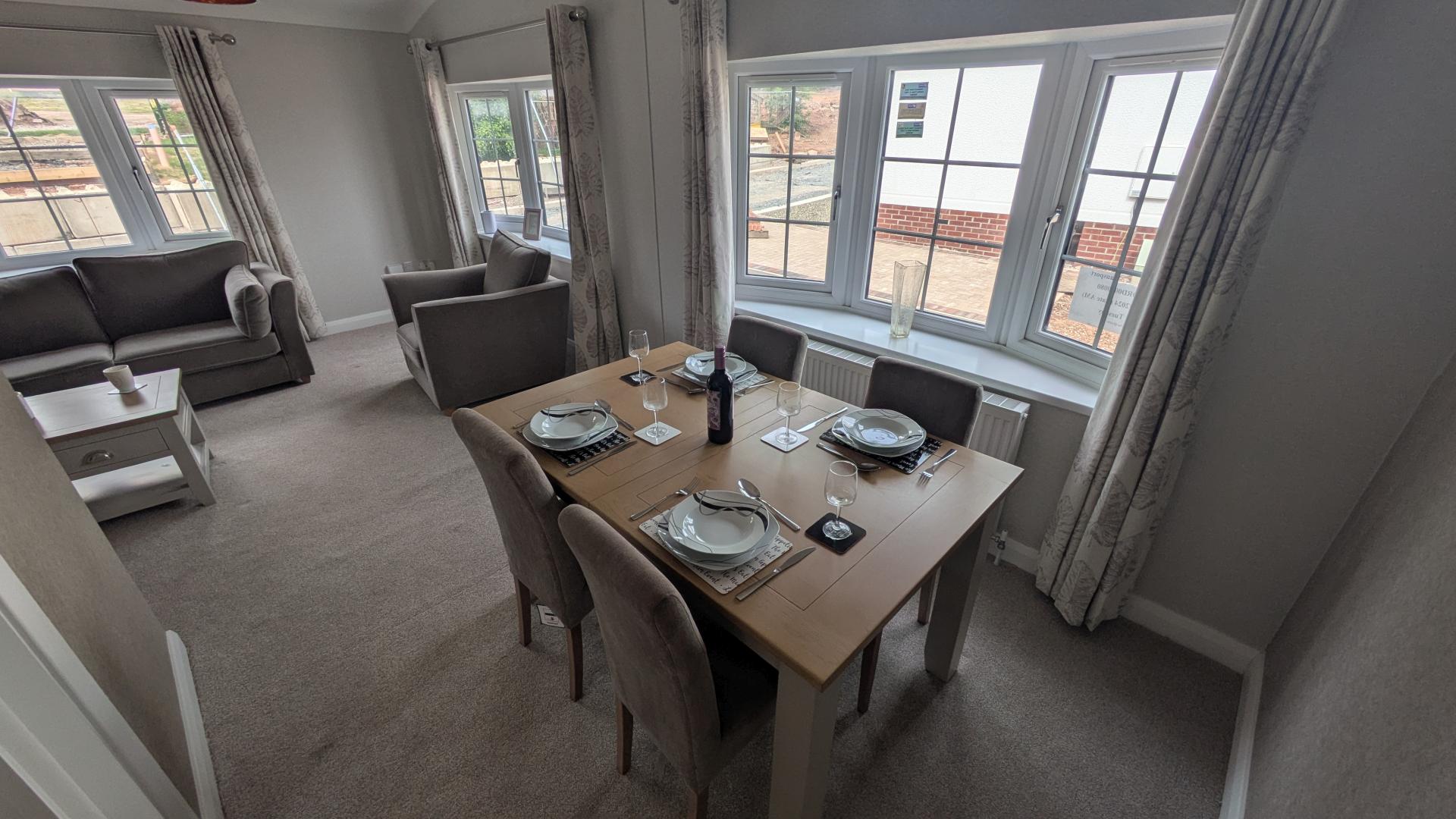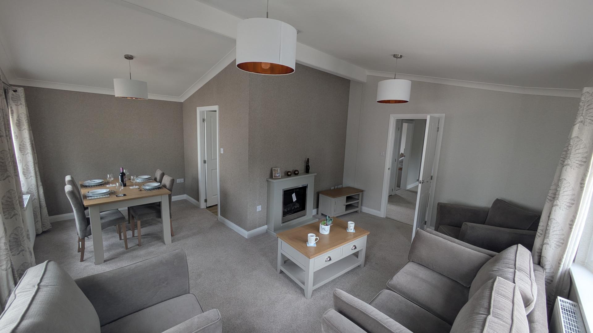 Accommodation is made up of 2 double bedrooms, with the master offering an ensuite with walk in shower, whilst the family bathroom offers a shower over bath. Offered for sale fully furnished with quality modern furniture and pastel coloured décor throughout are all designed to help make your move that little bit easier. The interior design of the Hazlewood offers a semi open plan living space with cathedral-style vaulted ceilings. The large modern fully fitted kitchen offers plenty of storage and comes with integrated appliances. The lounge and dining areas have large bay windows allowing lots of natural light to flood into the home.